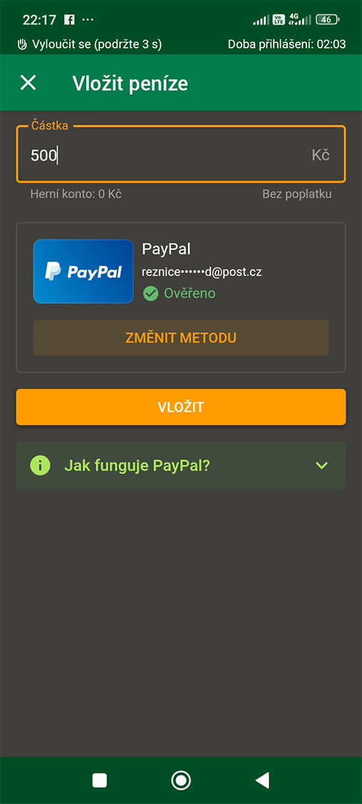 Nyní se pojďme blíže podívat na to, jak celý proces vkladů prostřednictvím PayPal funguje. U všech kroků vám přinášíme přehledné screenshoty, které vám jistě pomohou při orientaci.