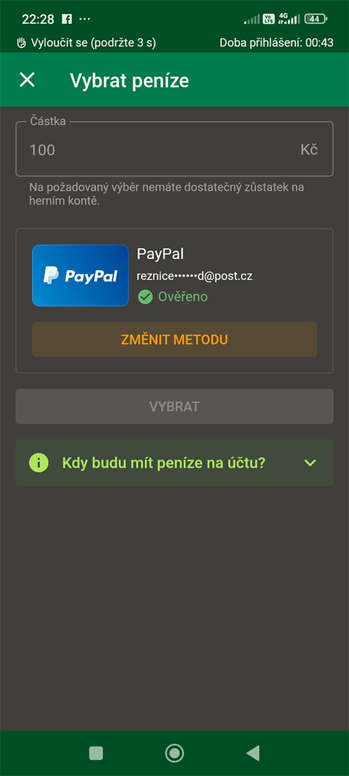 PayPal je možné využít pro výběry pouze v případě, že už jste prostřednictvím něj provedli vklad. Pokud jste tak neučinili, nebudete jej moci zvolit pro výběr.