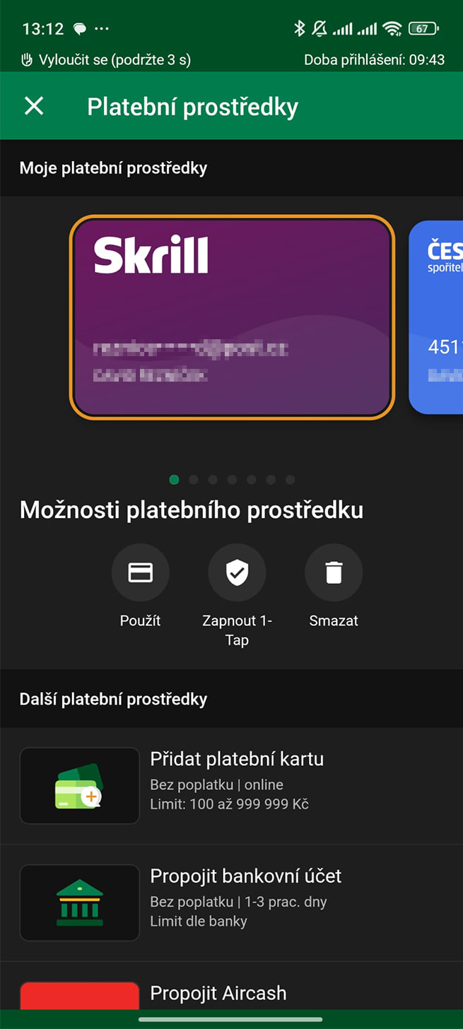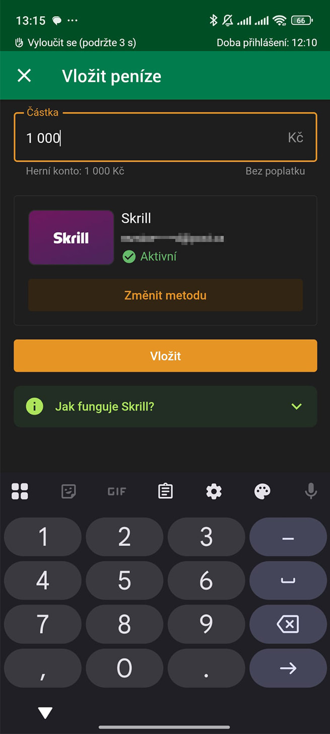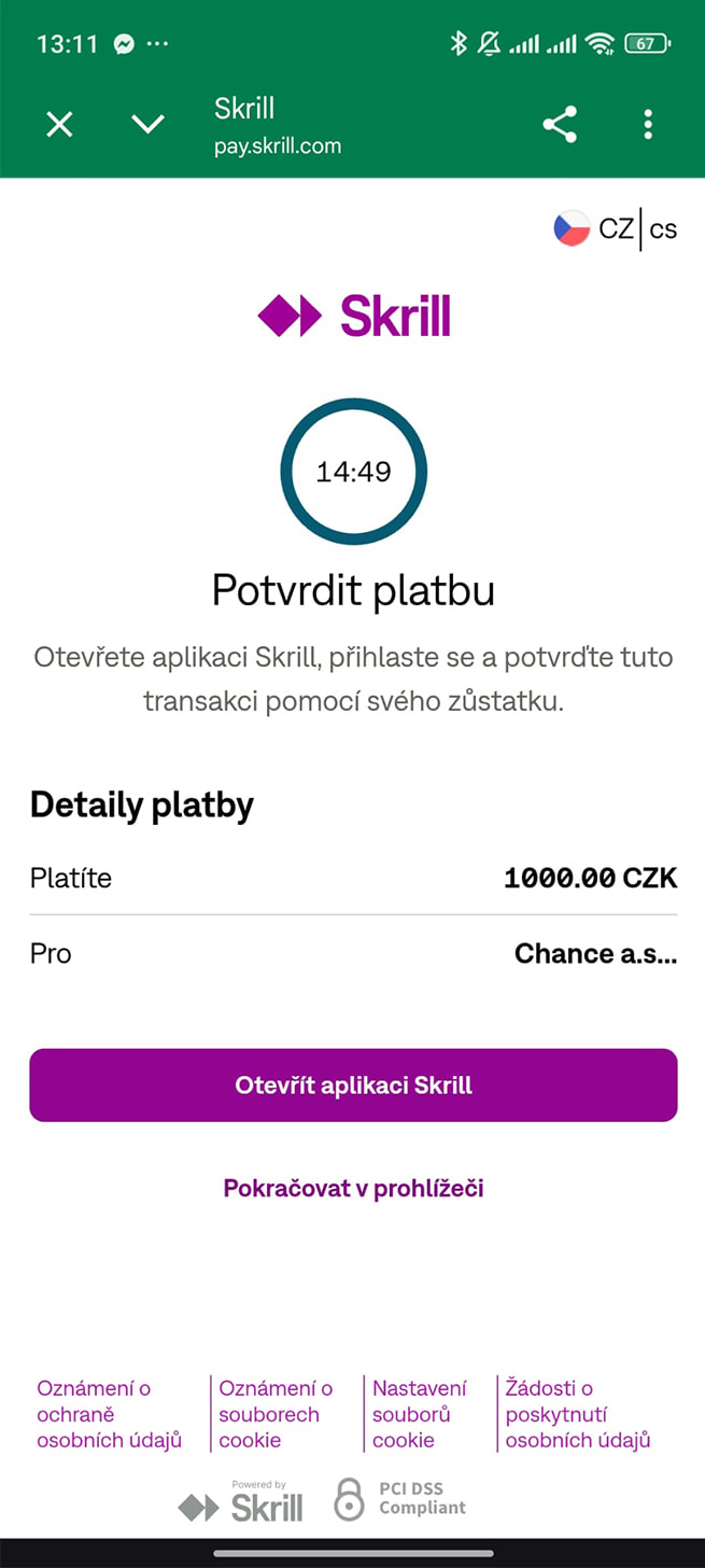 Po zadání částky vás casino přesměruje na stránky Skrill. Zde si můžete vybrat, zda platbu potvrdíte v aplikaci nebo prohlížeči.