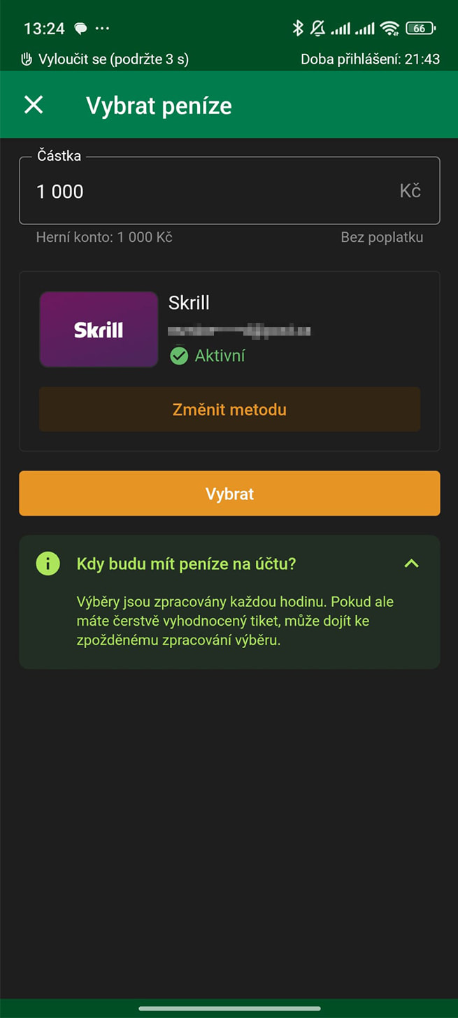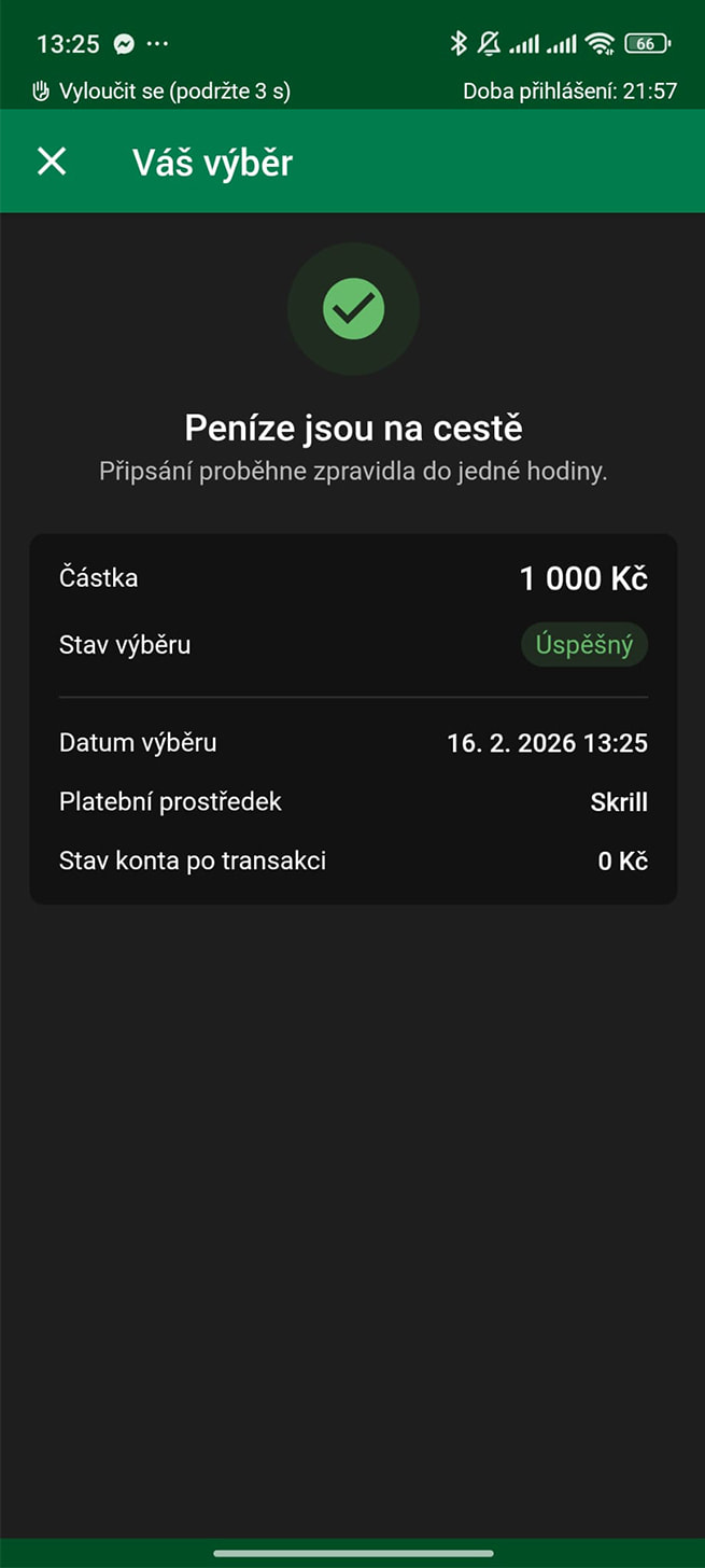 Váš výběr je dokončený a peníze jsou na cestě k vám. U Skrillu obvykle výběr proběhne okamžitě, maximálně pak do 1 hodiny.