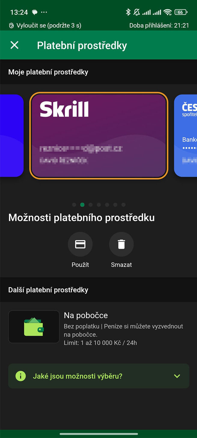 Výběr: Okamžitě, 100 Kč až 100 000 Kč, Bez poplatku