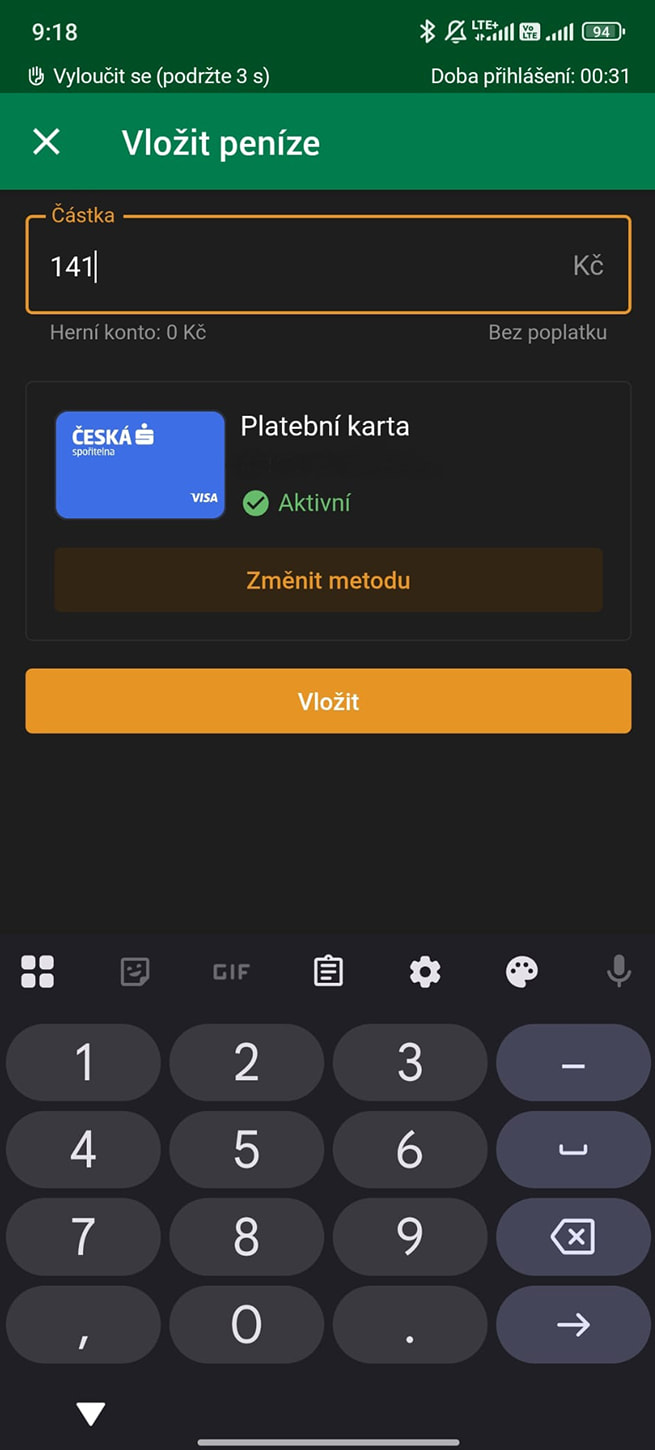 Vklad: Okamžitý, 10 Kč až neomezeně, Bez poplatku