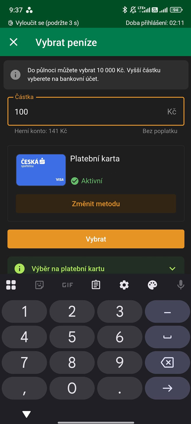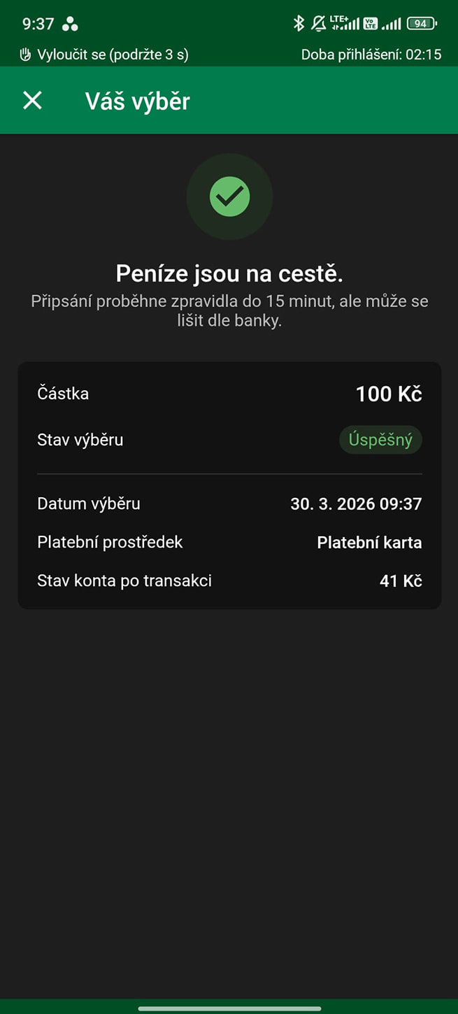 Výběr: Okamžitě, 100 Kč až 100 000 Kč, Bez poplatku