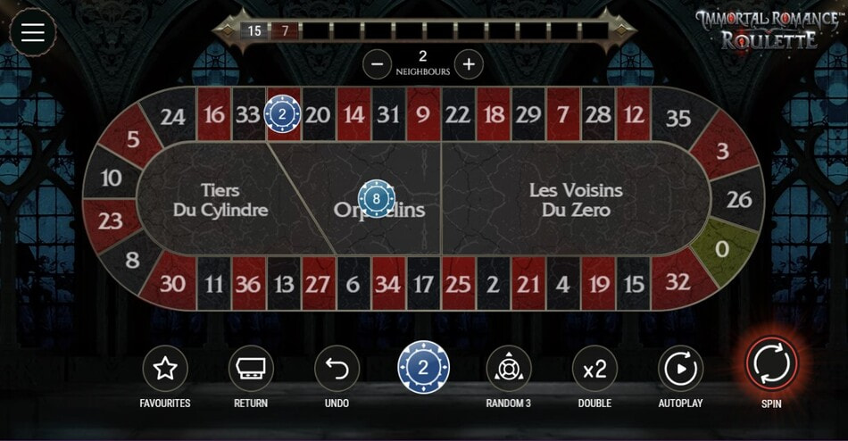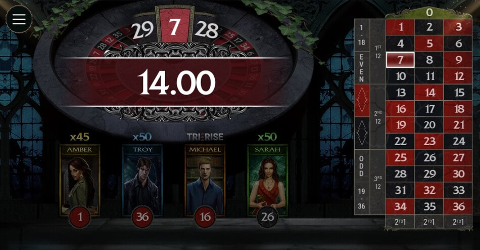 The dark, gothic atmosphere of Immortal Romance translates well to the roulette table. I think it’s one of the better-looking themed roulette games out there, with familiar characters framing the standard European layout.