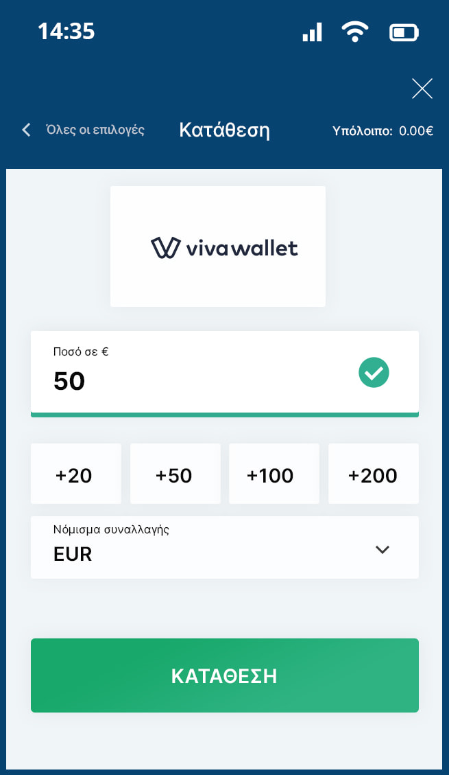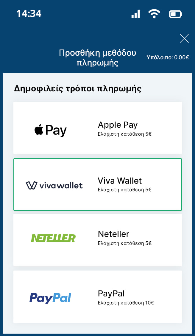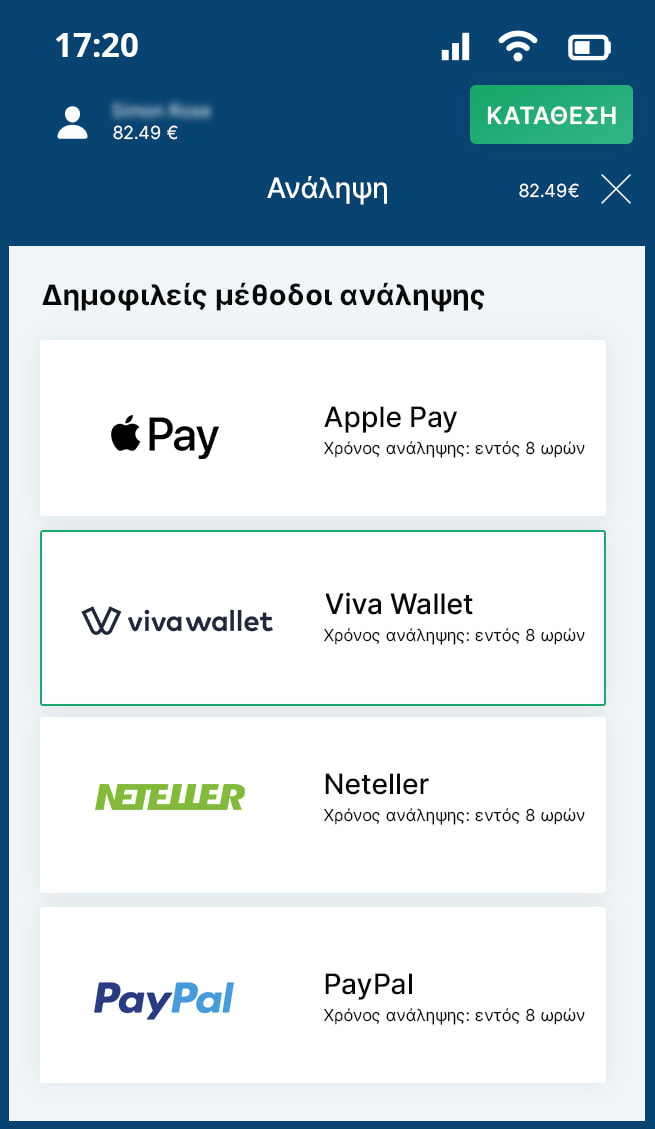 Επιλέξτε Viva Wallet από τη λίστα. Σημειώστε πως το Live Casino ενδεχομένως να ακυρώσει την ανάληψη αν δεν έχετε κάνει πριν κατάθεση με Viva Wallet