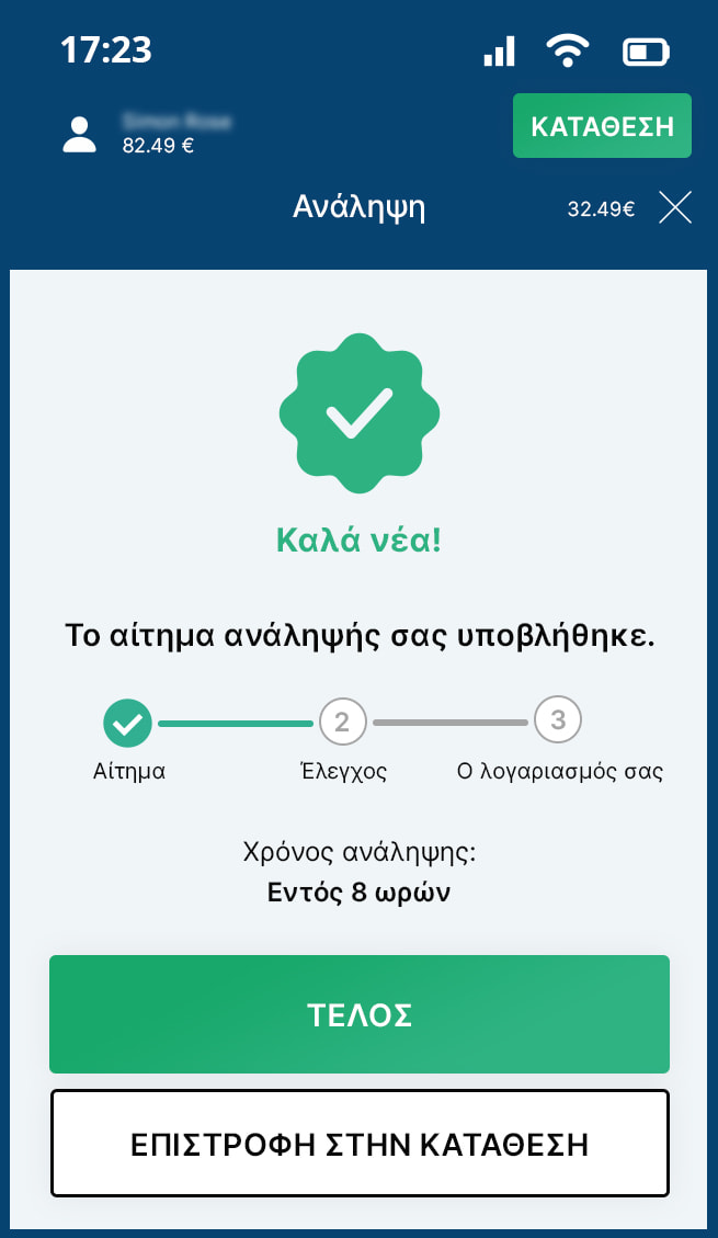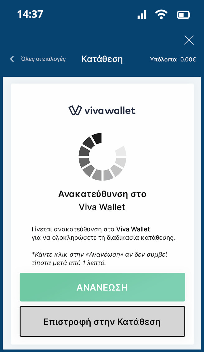 Θα λάβετε την ίδια στιγμή το μήνυμα επιτυχημένης κατάθεσης στο λογαριασμό σας.