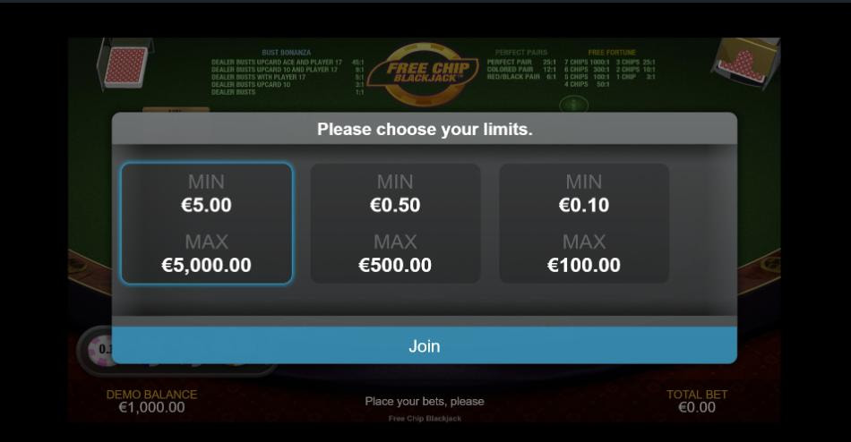 Le fiche disponibili vanno da 0,01€ a 25€ (0,01€, 0,10€, 0,50€, 1€, 5€, 10€, 25€). I limiti di puntata variano da 1€ a 300€ per mano.