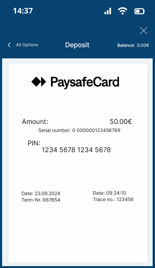 You will be prompted to enter the 16-digit PaysafeCard PIN code, which you will have received when purchasing at the sales outlet or online store. Click “PAY” to confirm the payment.