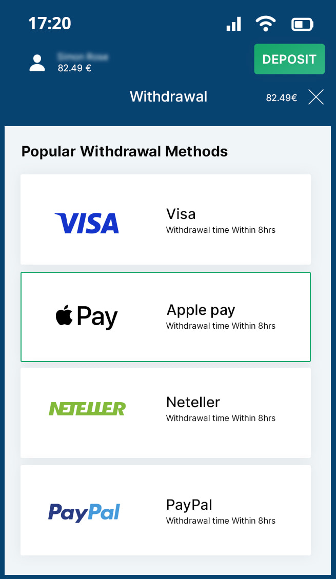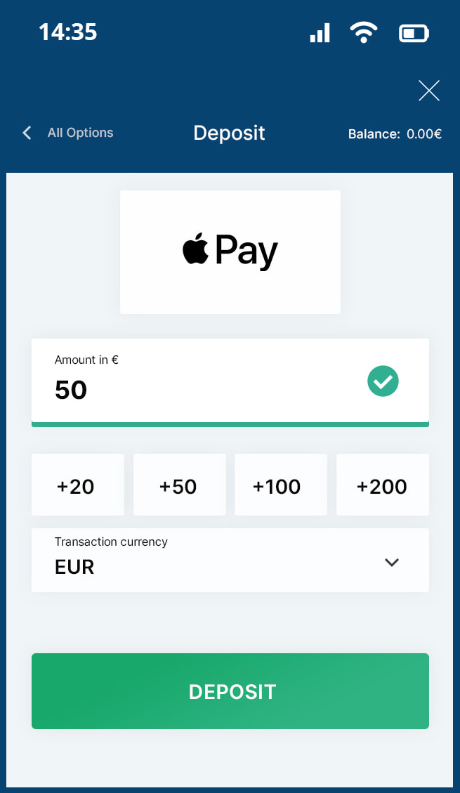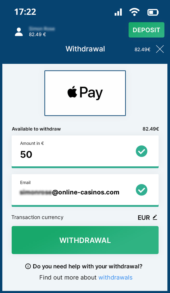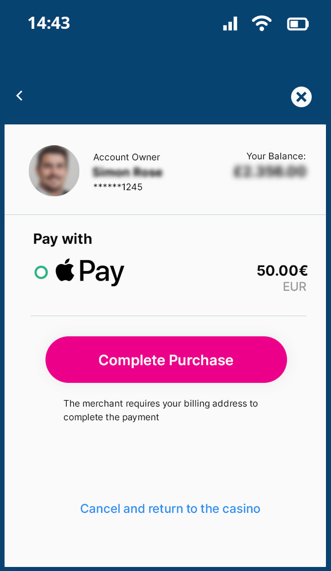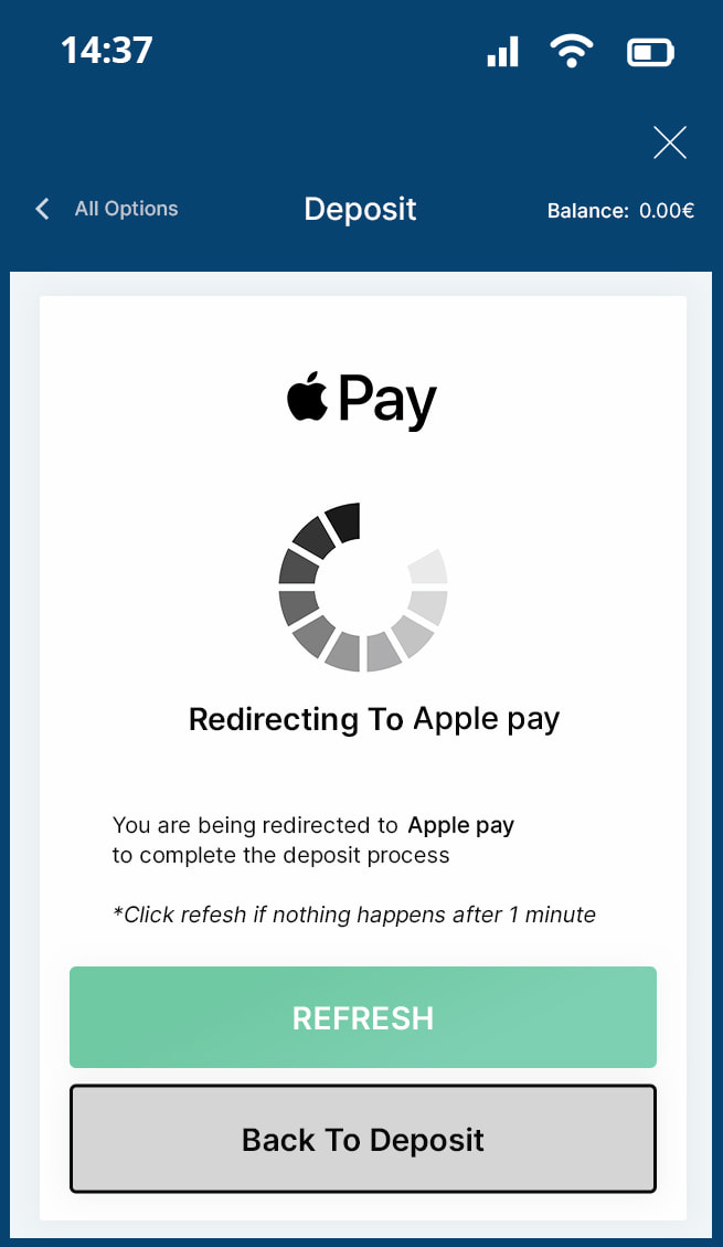 Once you have sent the deposit via Apple Pay, the funds will appear in your casino account balance.