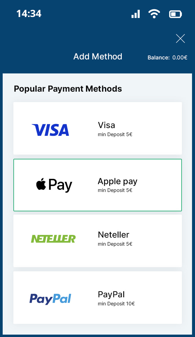 Look through the payment methods available and choose Apple Pay. Don’t forget to check the minimum and maximum casino deposit amounts.