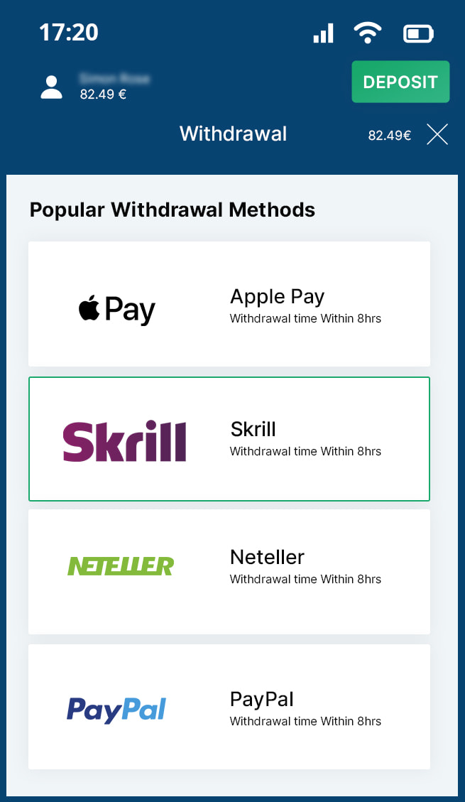 Withdrawal: 1 – 4 Days, 20€ – 5,000€/Daily, First withdrawal for the week is free, next ones – €5 fee.