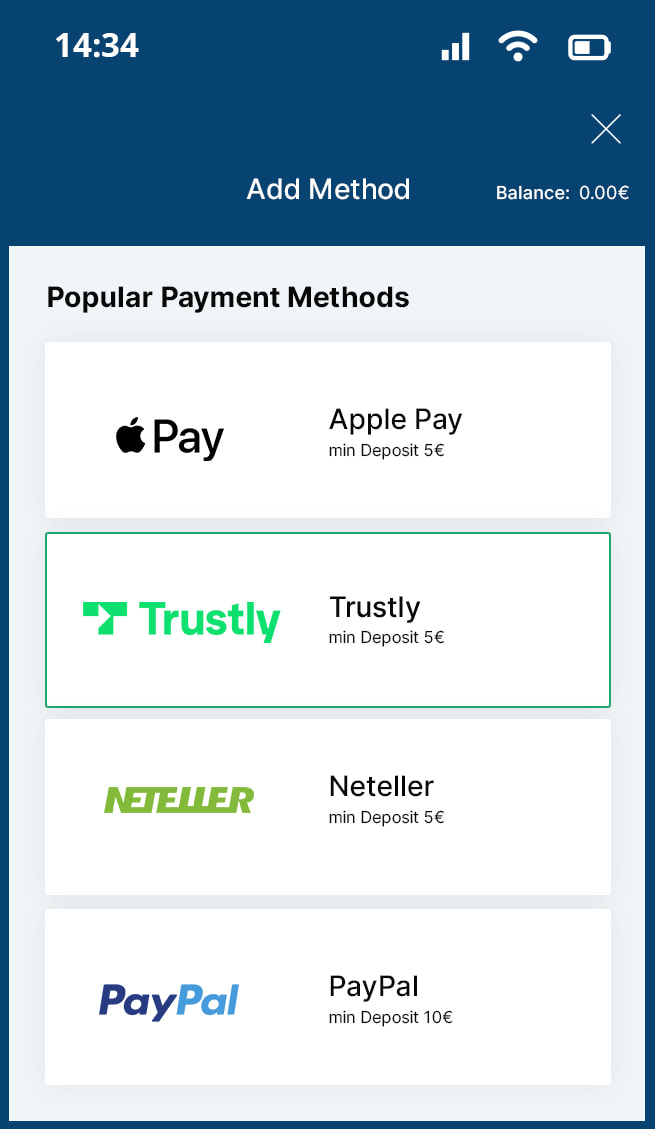 Trustly is an open‑banking payment method that connects directly to your bank, offering instant deposits and convenient withdrawals.
