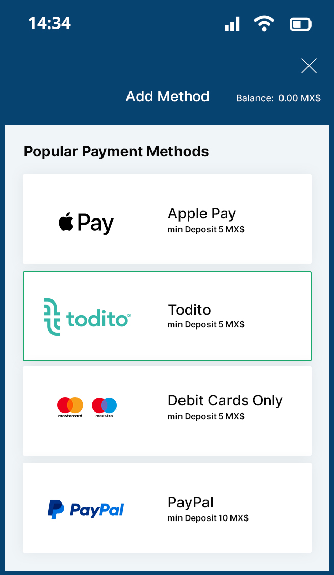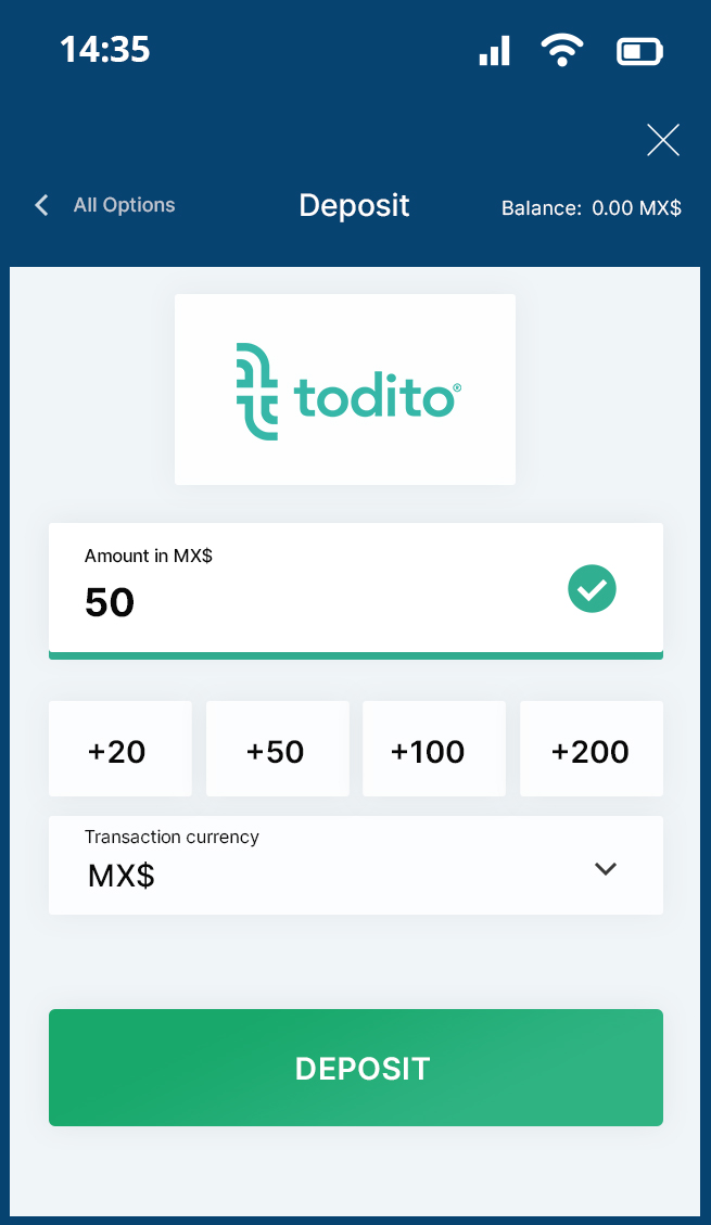 The Todito Cash deposit flow is typically consistent across casinos, although small differences may apply. Some sites process Todito as a prepaid card, while others redirect you to confirm the payment inside the Todito app. Either way, the deposit is typically instant.