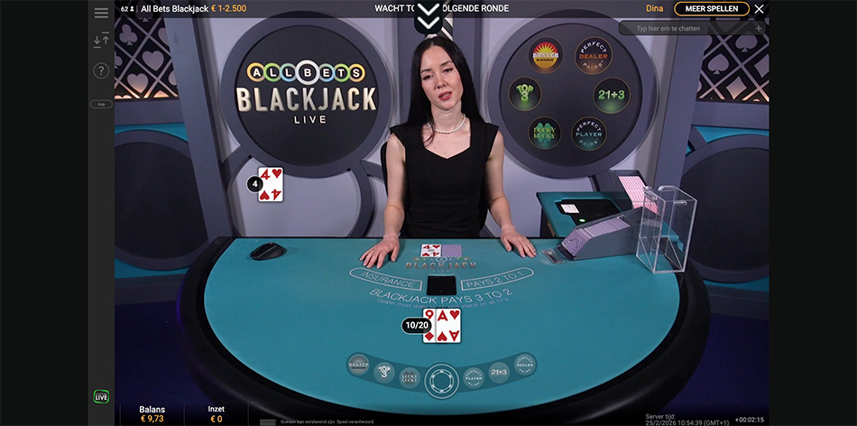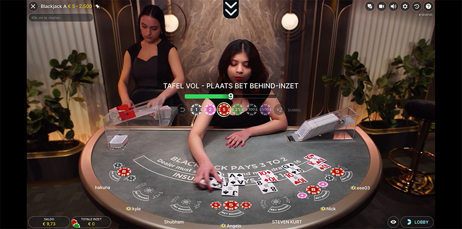 Dit is de absolute basis van live blackjack en vaak de eerste tafel die je in de lobby ziet. Je speelt hier met de standaard Evolution regels: 8 decks, de dealer past op 17 en je kunt dubbelen op elke twee kaarten. Omdat Blackjack A vaak lage limieten hanteert, zit de tafel bijna permanent vol. De belangrijkste functie is hier dan ook Bet Behind. Hiermee kun je inzetten op de hand van een zittende speler terwijl je wacht op een vrije stoel.