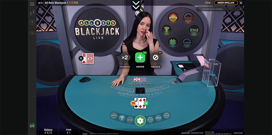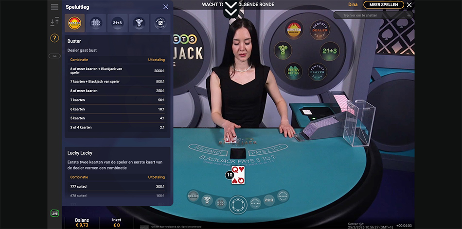 Dit is Playtechs antwoord op de zogenaamde scalable tafels, wat betekent dat er altijd plek is omdat iedereen met dezelfde hand speelt tegen de dealer. Het grote verkoopargument hier is de naam: je kunt inzetten op maar liefst zes verschillende side bets, waaronder Buster Blackjack, Lucky Lucky en 21+3. Het spel gebruikt 8 decks en de dealer past op elke 17. Hoewel het basisspel een prima RTP heeft, moet je als speler wel weten dat de variantie door die side bets flink omhoog schiet.