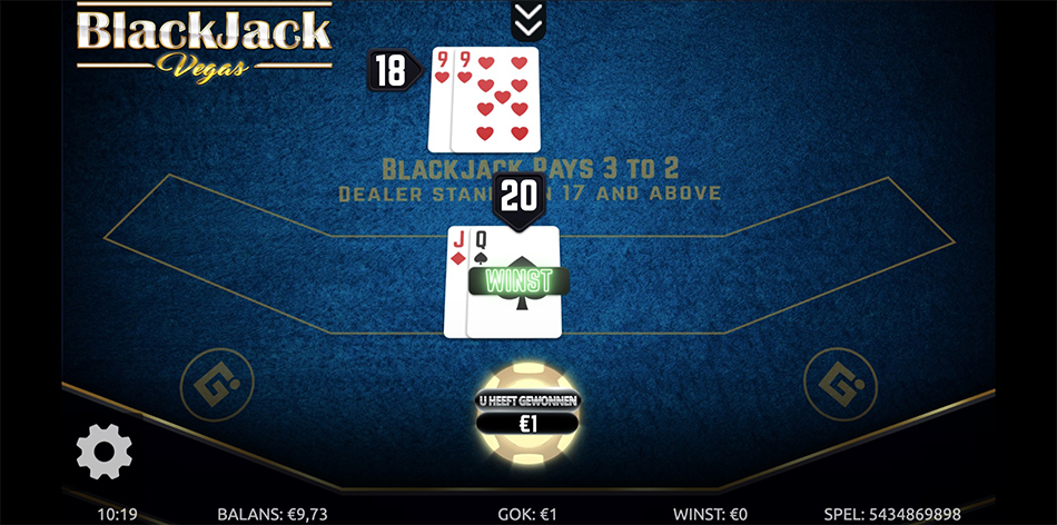 Een gewonnen hand levert 1:1 op en blackjack betaalt de standaard 3:2.