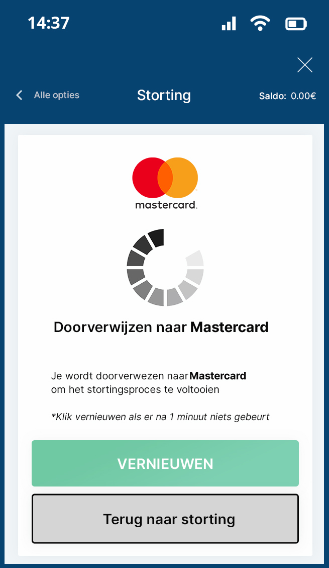 Je komt op de Mastercard pagina waar je de storting moet bevestigen via je online bankieren app. Gebruik je een desktop? Dan verschijnt er een pop-up, dus zorg dat je browser die niet blokkeert.