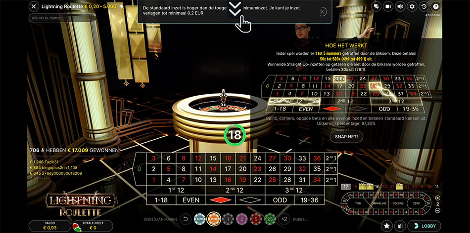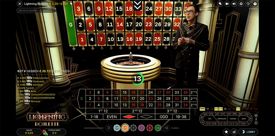 Lightning Roulette is het spel dat live roulette naar een groter publiek heeft gebracht. De basis is Europees roulette, maar elke ronde worden tot vijf nummers willekeurig geselecteerd als Lucky Numbers met multipliers van 50x tot 500x. Straight-up inzetten zonder multiplier betalen 29:1 in plaats van de gebruikelijke 35:1. Het is visueel indrukwekkend, snel en de spanning van een potentiële 500x hit maakt elke draai spannend.
