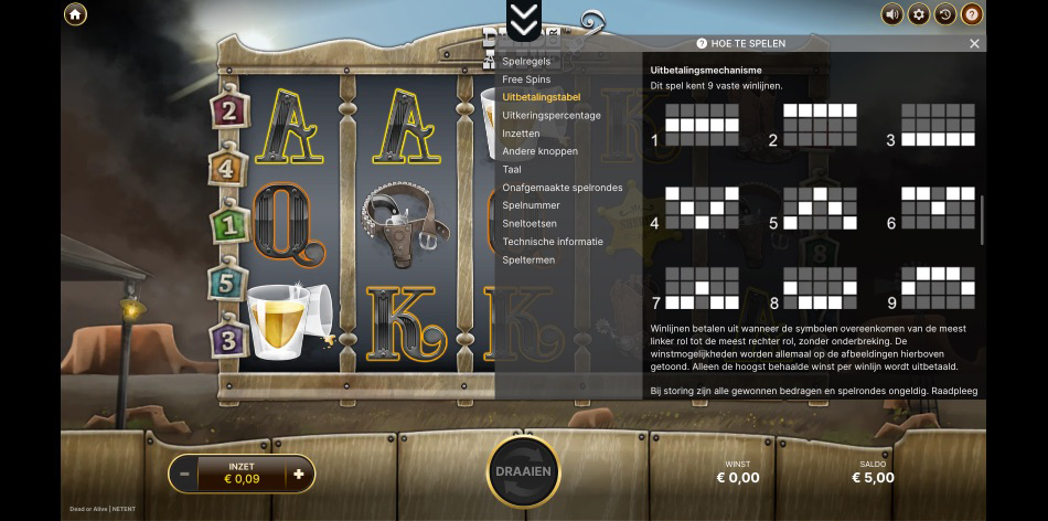 Het spelmechanisme is simpel: je hebt 5 rollen, 3 rijen en 9 vaste winlijnen. Je wint als je drie of meer gelijke symbolen op een winlijn draait, van links naar rechts. De enige uitzondering is de Scatter (de gekruiste pistolen); deze betaalt uit ongeacht waar hij op de rollen landt. Twee pistolen leveren je inzet terug, maar drie of meer sturen je naar de beruchte bonusronde.