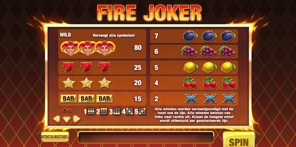 Met slechts vijf winlijnen is Fire Joker overzichtelijk vanaf de eerste spin. Geen wilds, geen scatters, geen free spins. Dat klinkt misschien karig, maar het werkt juist in het voordeel van deze slot.