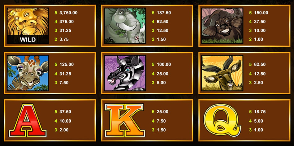 De symbooltabel past bij het safari-thema. Laag-betalende symbolen zijn de bekende speelkaartwaarden. De premium symbolen zijn Afrikaanse dieren, en die brengen het echte geld.