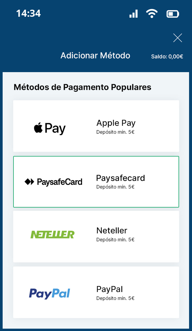 1. Seleciona PaysafeCard na área de pagamentos do casino.