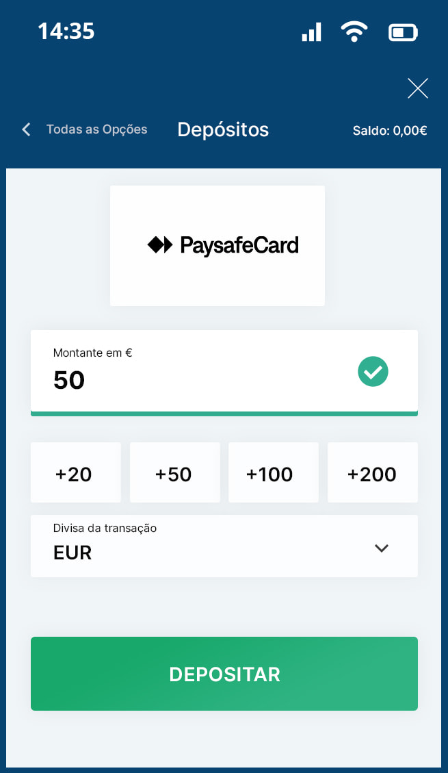 Decide quanto queres depositar, com base nos limites mínimos e máximos para o PaysafeCard no casino online da tua escolha. Usa um código de bónus se aplicável.