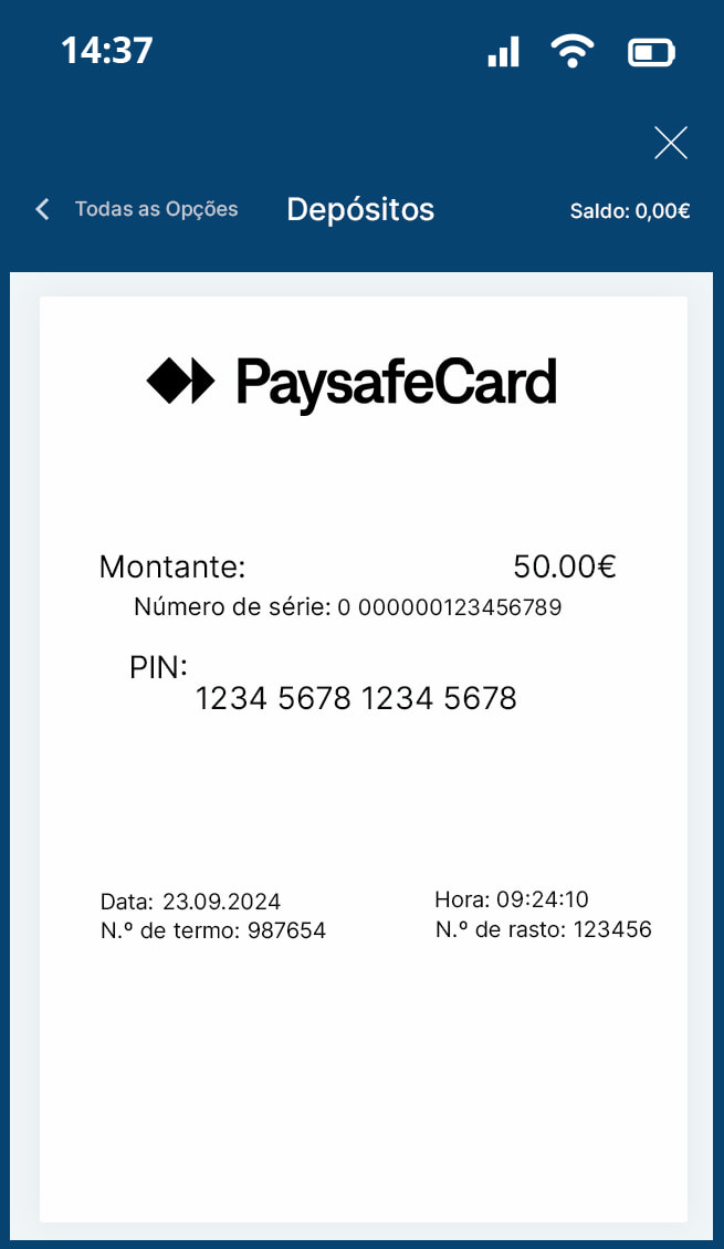 O montante máximo por transação está disponível no site da PaysafeCard de forma pública e esses limites são válidos em Portugal. Os códigos pré-pagos PaysafeCard podem ser adquiridos em diferentes montantes.