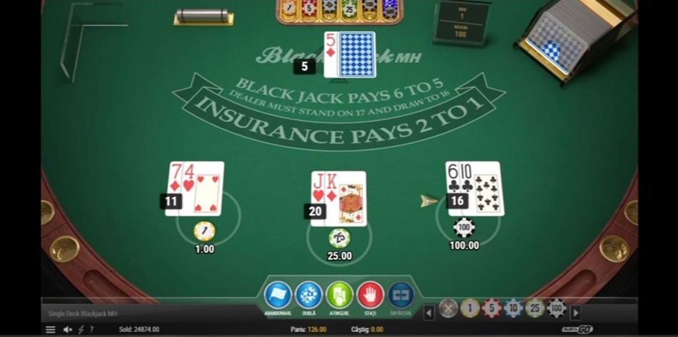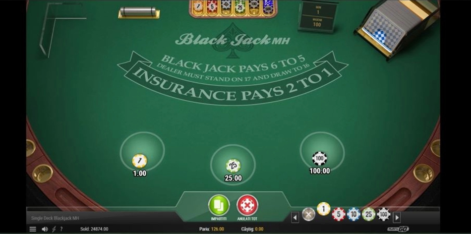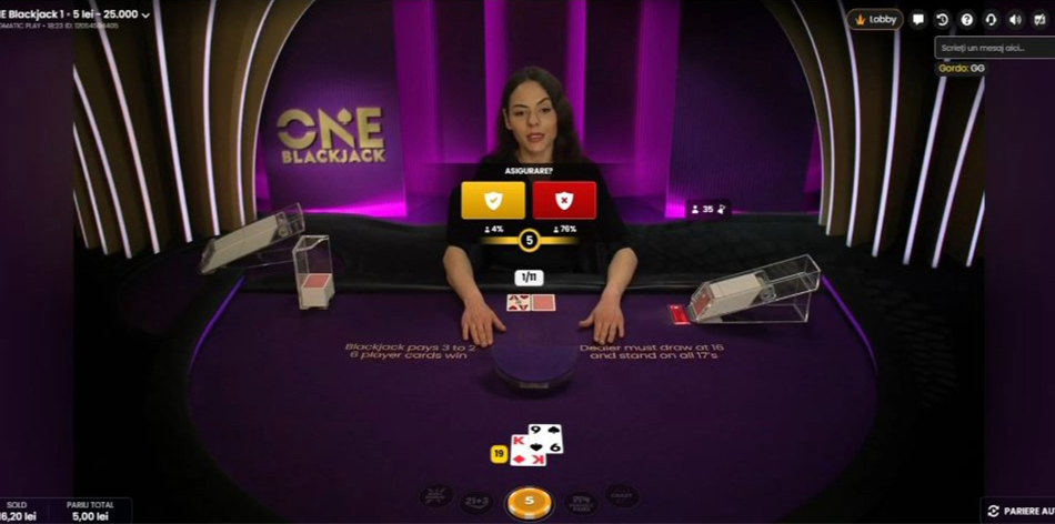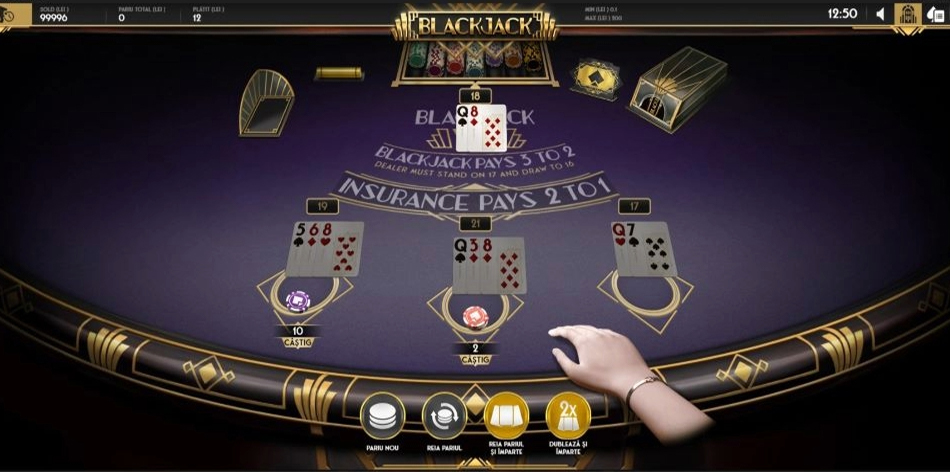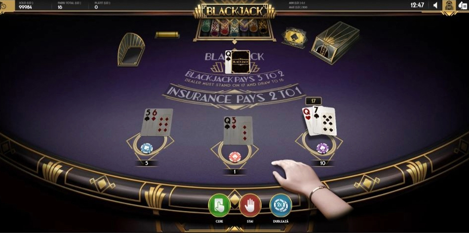 Insurance sau Asigurare: pariu secundar disponibil când dealerul arată un As. Poți cere asigurare, iar costul este jumătate din miză. Dealerul verifică dacă are blackjack (adică o carte de 10 puncte). Câștigi asigurarea doar dacă atât tu, cât și dealerul aveți blackjack. Plata este 2:1.