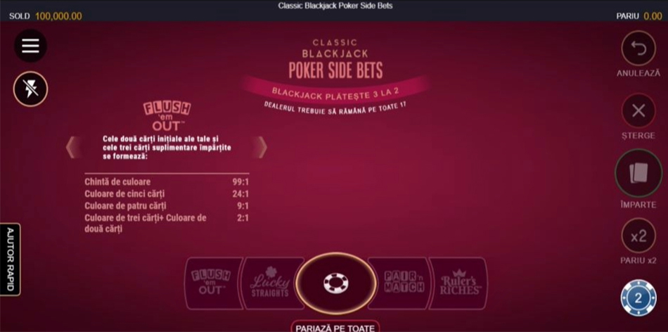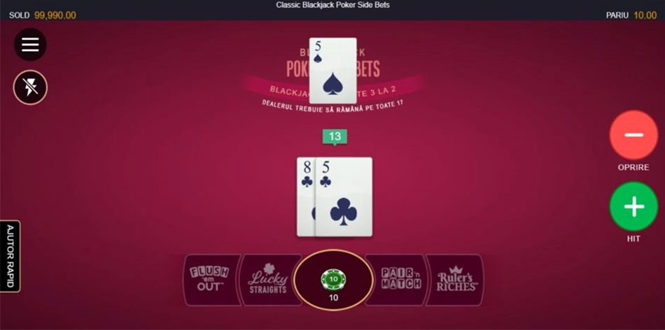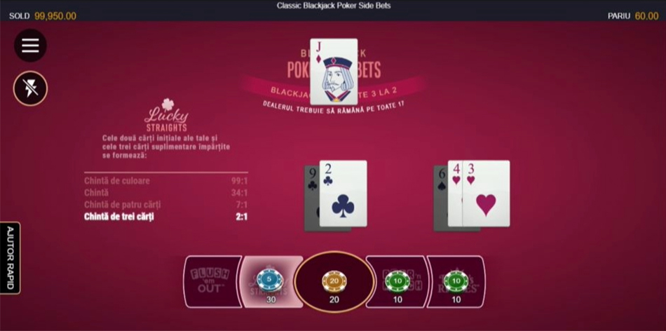 Classic Blackjack Poker Side Bets de la Games Global este o combinație de blackjack și poker, pe care nu o găsești la mesele cu dealer live. Are 4 pariuri laterale la poker și 4 șanse de câștig până la 100x miza. Câștigul clasic se plătește 1:1, blackjack plătește 3:2 și se joacă cu 6 pachete de cărți.