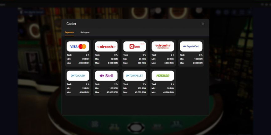 Visa, Mastercard, Skrill, PaysafeCard, Neteller, Apple Pay, Abon, Maestro, Bank TransferLimite de pariere la blackjack: