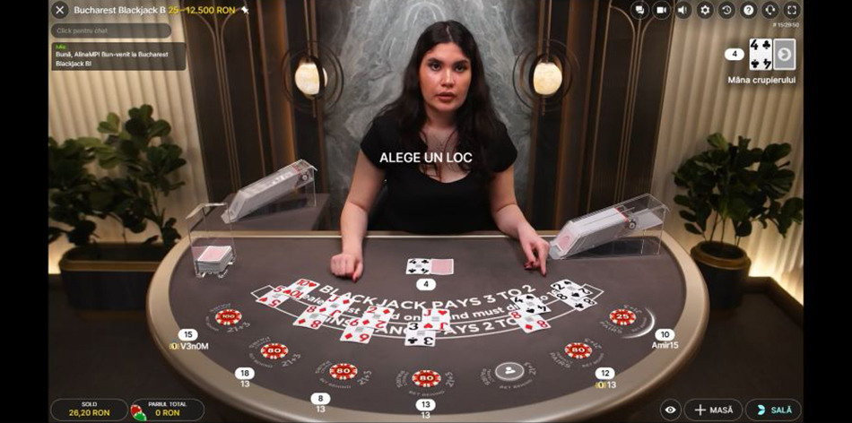 Pariuri plasate la masa live Bucharest Blackjack, cu miză pornind de la 25 RON.