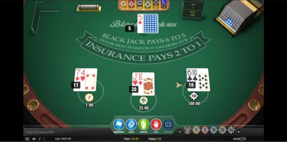 Blackjack Multihand Single Deck de la Play’n GO se joacă cu un singur pachet de cărți. Toate câștigurile normale se plătesc la o cotă de 1:1, dar blackjack plătește 6:5. O mână cu valoarea 21 după divizare este considerată 21, nu Blackjack. RTP este de 98,89%.