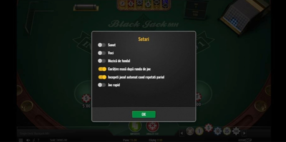 Setări pe care le poți face la Blackjack Multihand Single Deck.