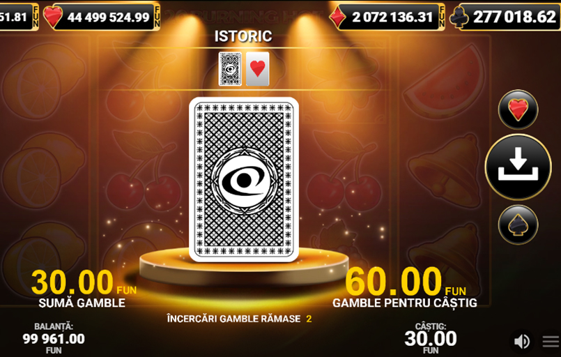 Funcția Gamble este disponibilă la fiecare câștig cu o valoare mai mică sau egală cu 35x suma pariată. Prin intermediul ei, dacă pariezi pe culoare cărților extrase (roșu/negru), poți multiplica câștigurile obținute.