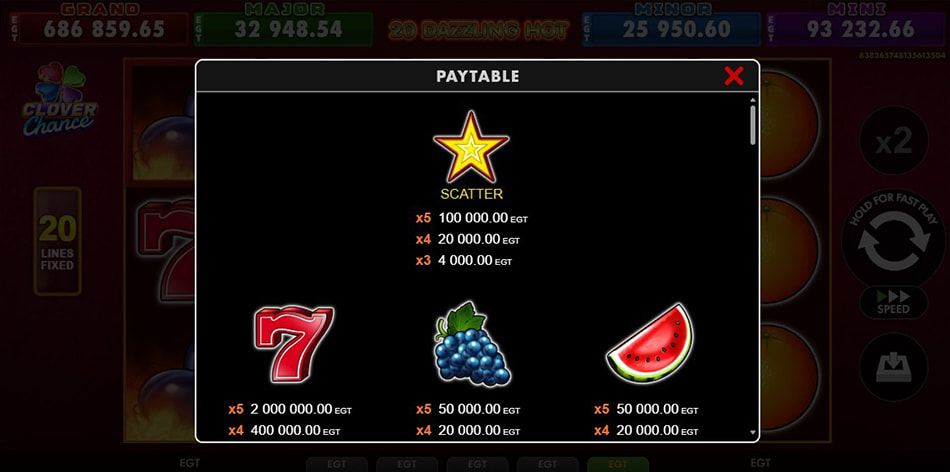 20 Dazzling Hot de la EGT Digital este un slot clasic din colecția dezvoltatorului, cu 20 de linii și RTP de 96.54%. Se remarcă prin volatilitate medie, gameplay rapid și stil tradițional cu simboluri fructate, oferind o experiență simplă, dar dinamică.