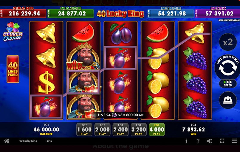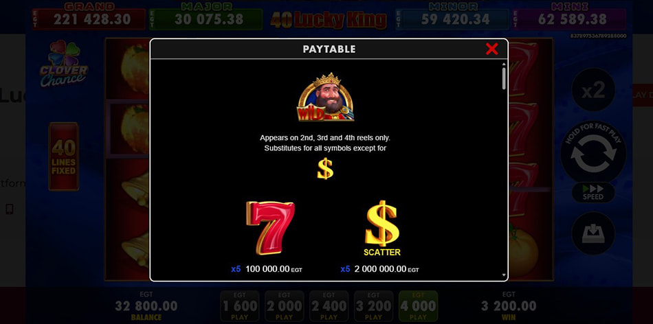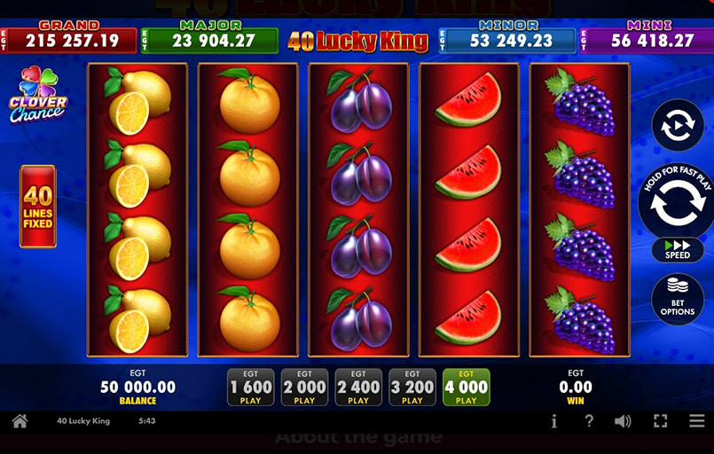 40 Lucky King, dezvoltat de EGT Digital, este un slot video clasic cu 5 role, 4 rânduri și 40 de linii. Iese în evidență prin jackpot progresiv pe 4 niveluri, Mystery Bonus bazat pe alegerea cărților și simbol Wild stacked, într-un stil simplu și ușor de urmărit.