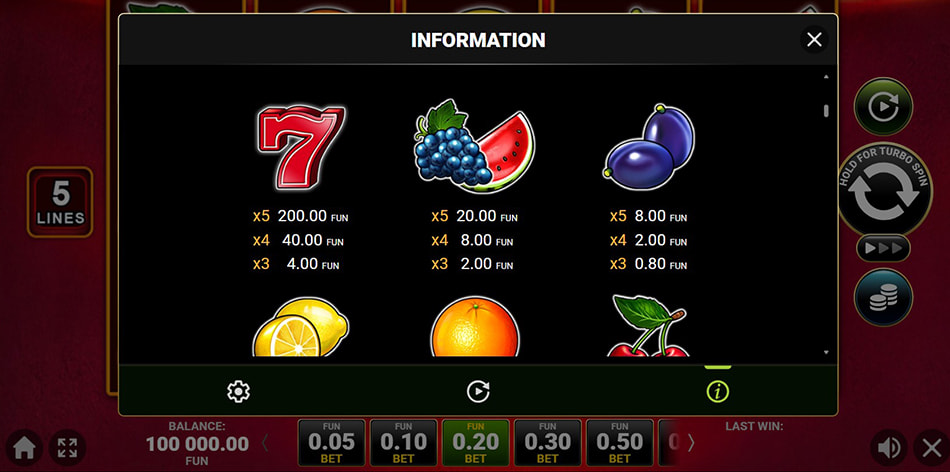 Simbolurile clasice de fructe completează tabelul de plăți. Strugurii și pepenele oferă câștiguri medii, în timp ce lămâile, portocalele, prunele și cireșele generează premii mai mici, dar apar mai frecvent pe role.