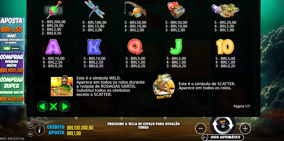 Simbolurile clasice includ pești, plute, undițe, libelule și cutii de pescuit, completate de cărți cu valoare mare. Combinațiile câștigătoare se formează pe linii fixe, iar simbolurile cu pești sunt cele care pot aduce cele mai mari plăți.