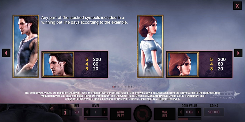 Simbolurile principale sunt Dracula și partenera sa, ambele disponibile și în versiune extinsă pe role. Pentru cinci simboluri identice pe o linie, fiecare plătește 200 monede. Bătrâna și cei doi bărbați oferă câte 60 monede pentru cinci apariții.