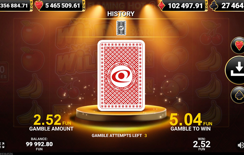 O funcție suplimentară importantă în Flaming Hot 6 Reels este jocul Gamble. După orice câștig, jucătorii pot alege să riște suma obținută pentru a o dubla, ghicind corect culoarea unei cărți ascunse.