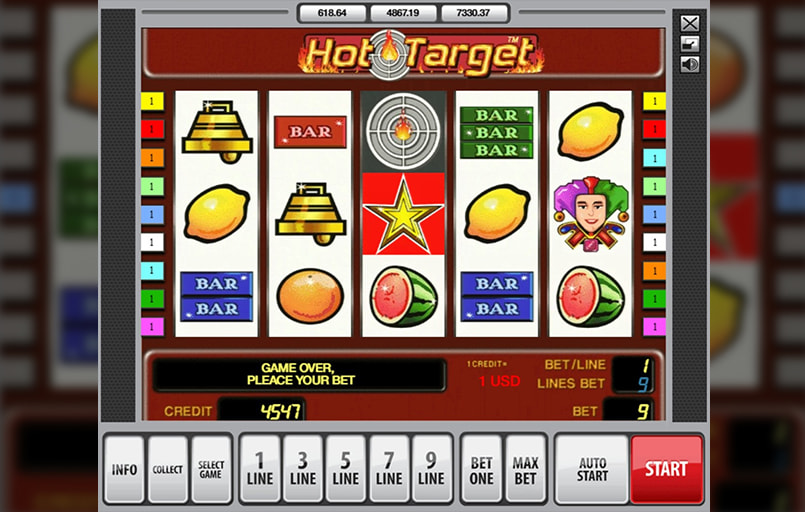 Hot Target este un slot clasic Novomatic, construit pe o structură simplă. 5 role, 9 linii active și 15 simboluri vizibile. Jucătorii pot ajusta liniile, valoarea unui credit și numărul de credite pe linie, exact ca la aparatele tradiționale.