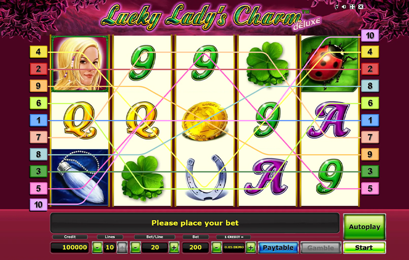 Lucky Lady’s Charm este un slot popular dezvoltat de Novomatic, lansat inițial ca joc land-based și ulterior adaptat online în versiunea Deluxe. Jocul are un RTP de aproximativ 97,10%, 5 role și până la 10 linii de plată, fiind cunoscut pentru runde gratuite și multiplicatori care pot crește semnificativ câștigurile.