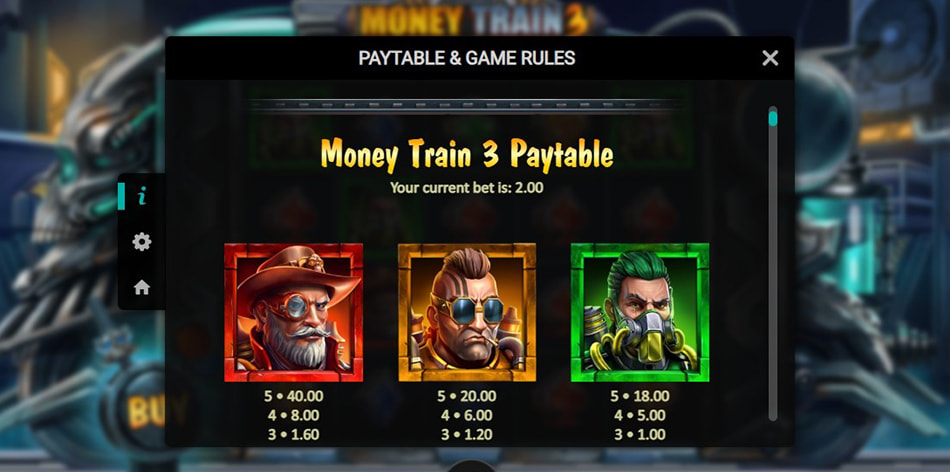 Money Train 3 se joacă pe 40 de linii fixe, iar câștigurile se formează de la stânga la dreapta. Simbolurile wild apar pe toate rolele și înlocuiesc orice simbol plătitor, având valoarea celui mai bine plătit simbol premium.