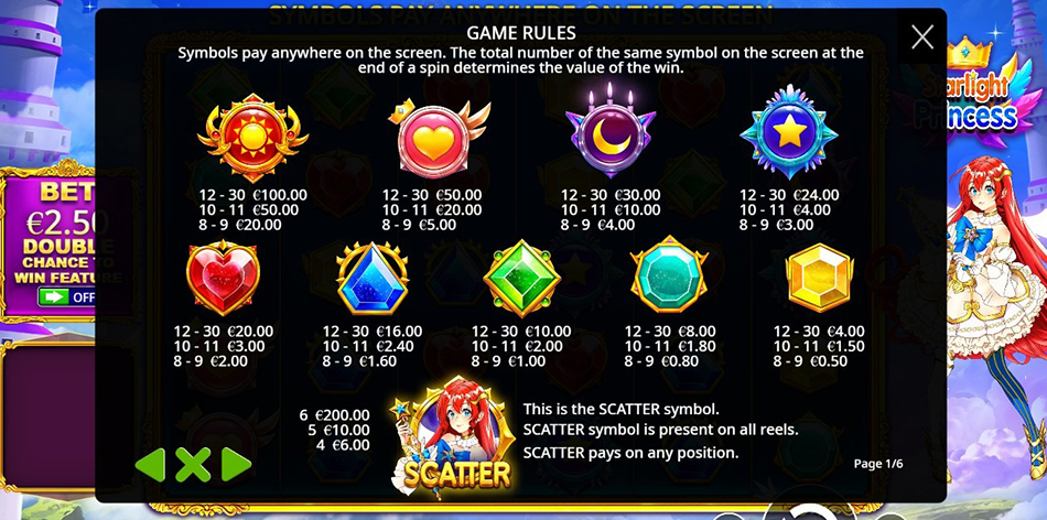 Starlight Princess este un slot video cu 6 role și 5 rânduri, care renunță complet la liniile clasice de plată și folosește un sistem „plătește oriunde”. Câștigurile apar atunci când cel puțin 8 simboluri identice sunt vizibile pe ecran.