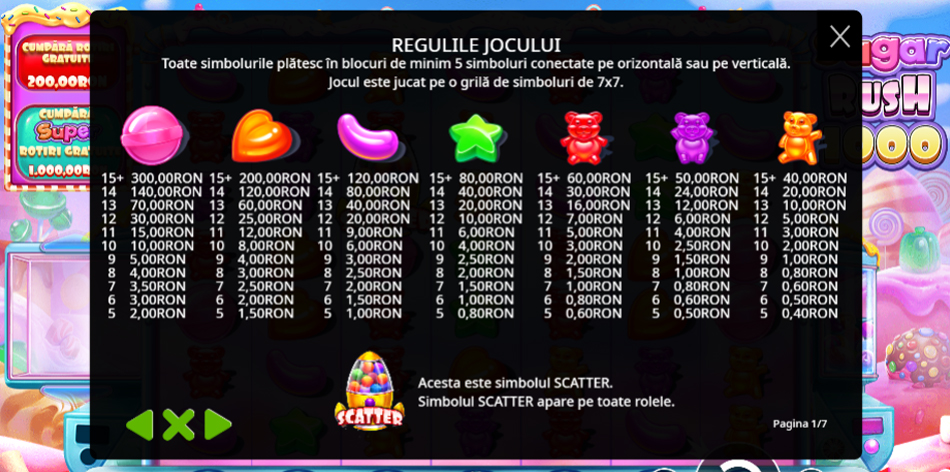La fel ca și varianta originală, Sugar Rush 1000 slot online are o structură de 7 role și 7 rânduri, care folosește mecanica de plată colapsabilă pentru formarea câștigurilor. Astfel, pentru a câștiga, ai nevoie de 5 sau mai multe simboluri identice conectate orizontal sau vertical.