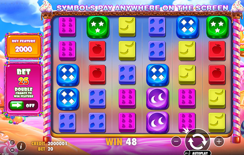 Sweet Bonanza Dice păstrează formula clasică Sweet Bonanza, cu o grilă 6×5 și câștiguri prin simboluri dispersate. Cascada de simboluri menține ritmul alert, iar jocul este ușor de urmărit, chiar și pentru jucătorii mai puțin experimentați.
