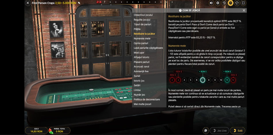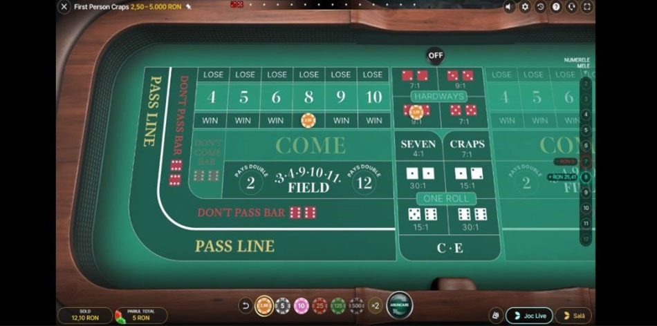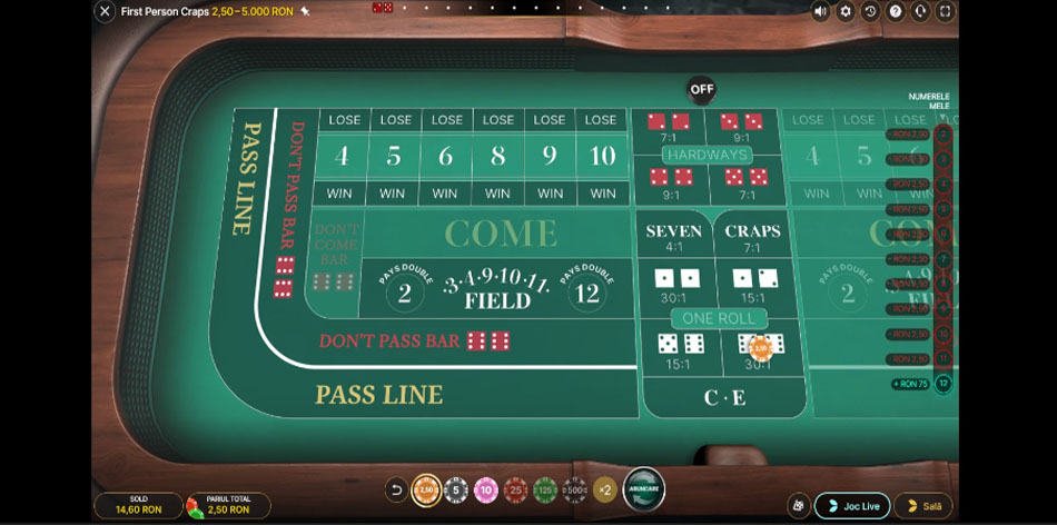 Craps First Person online este un joc de zaruri mult mai elaborat, dar cu mecanism automat, cu pariuri pe numere, pe care poți să-l joci inițial cu opțiuni de pariere reduse. Tutorialul interactiv explică regulile și pariurile. Statisticile dinamice se actualizează constant, arătând în timp real pariurile celorlalți jucători.