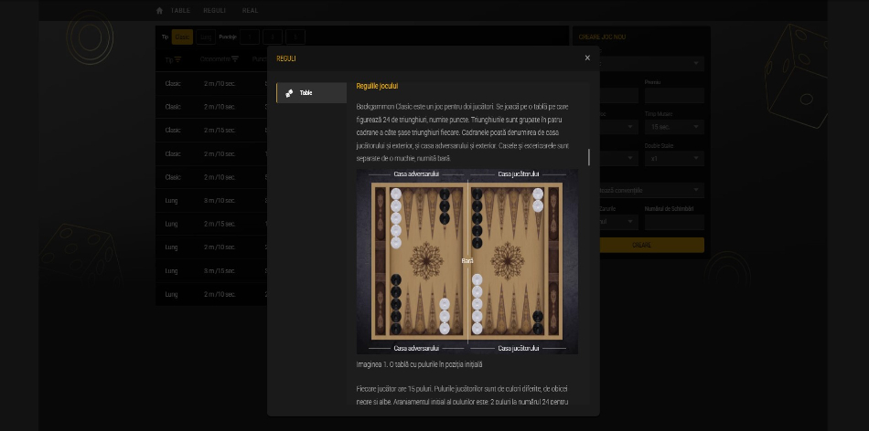 În cazinoul recomandat găsești jocul de table online pe bara de meniu, exact cu această denumire. Jocurile RNG sunt sub denumirea Backgammon.