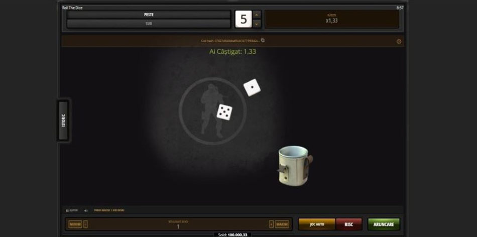 Roll the Dice, pariu setat peste 5, multiplicator de câștig 1,33x.